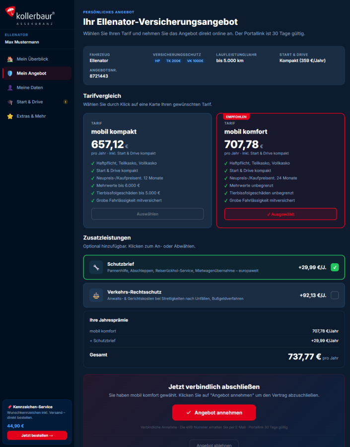 Das Besondere daran: Das Angebot kann nicht nur angesehen, sondern direkt weiter konfiguriert werden. Zusätzliche Bausteine wie ein Schutzbrief oder ein Verkehrs Rechtsschutz lassen sich mit wenigen Klicks ergänzen. So entsteht Schritt für Schritt eine Versicherungslösung, die zum eigenen Bedarf passt.